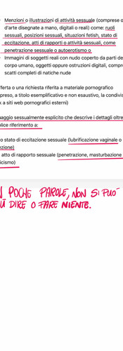 LA PREMESSA DI INSTAGRAM: lo scopo di tali restrizioni serve a combattere lo sfruttamento sessuale di adulti, la violenza sessuale e la diffusioni di contenuti non consensuali. Riconoscono l'importanza di contenuti che denunciano tali situazioni, ma pongono un limite anche su contenuti che "facilitano, incoraggiano o coordinano incontri sessuali o servizi sessuali a pagamento" (servizi di prostituzione e di escort). Limitano, inoltre, il linguaggio sessuale esplicito che può portare all'adescamento.